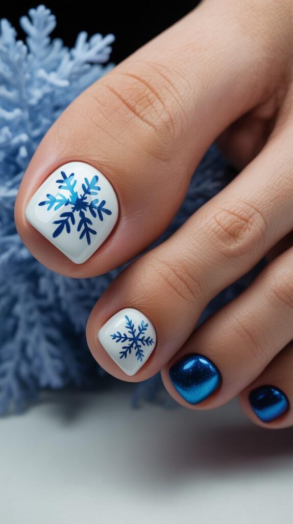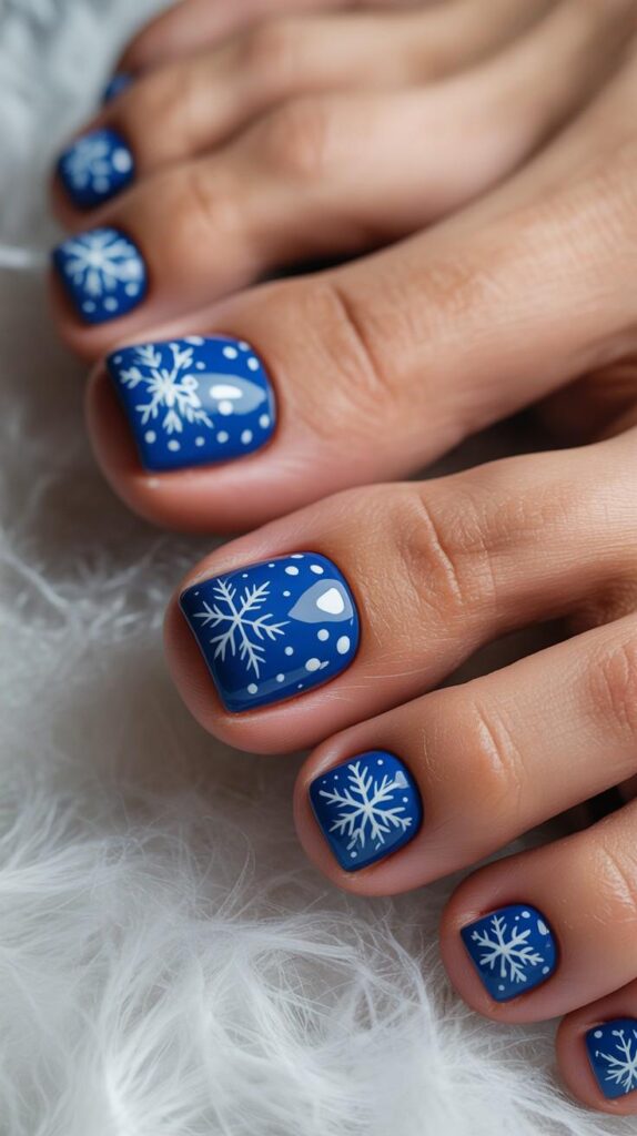 Vibrant royal blue polish gleams with high-gloss shine, while each toe features a bold white snowflake — like a winter wonderland captured in miniature. The crisp contrast makes it pop, perfect for snowy strolls or festive photo ops.