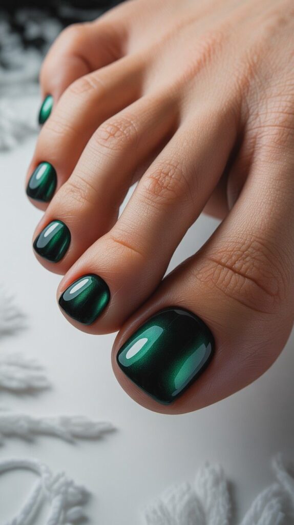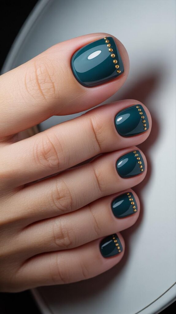 Rich emerald green polish meets crisp gold dot accents — like a luxury forest captured in miniature. The glossy finish catches every glint of light, making it perfect for evening events or snowy strolls. Paired with a sleek gray backdrop, this design whispers ‘elegant magic’ with every step.