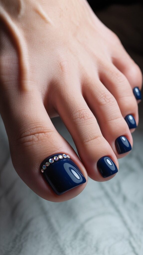 Deep navy blue polish meets a delicate crescent of iridescent rhinestones — like a frozen moonbeam caught on your foot. The glossy finish catches every glint of light, making it perfect for evening events or elegant winter weddings. Paired with a soft gray fabric backdrop, this design whispers ‘elegant magic’ with every step.