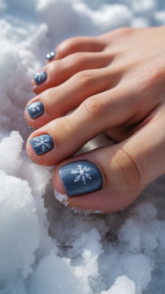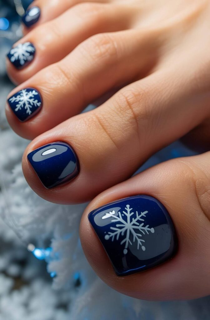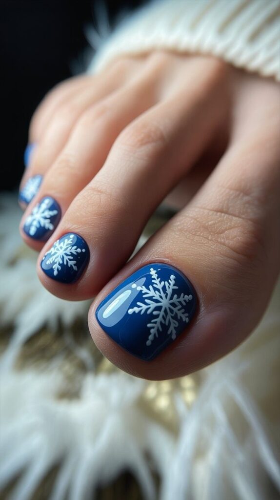 Deep navy blue polish gleams with high-gloss shine, while each toe features a bold white snowflake — like a winter wonderland captured in miniature. The crisp contrast makes it pop without overpowering your look, perfect for cozy nights in or festive gatherings.