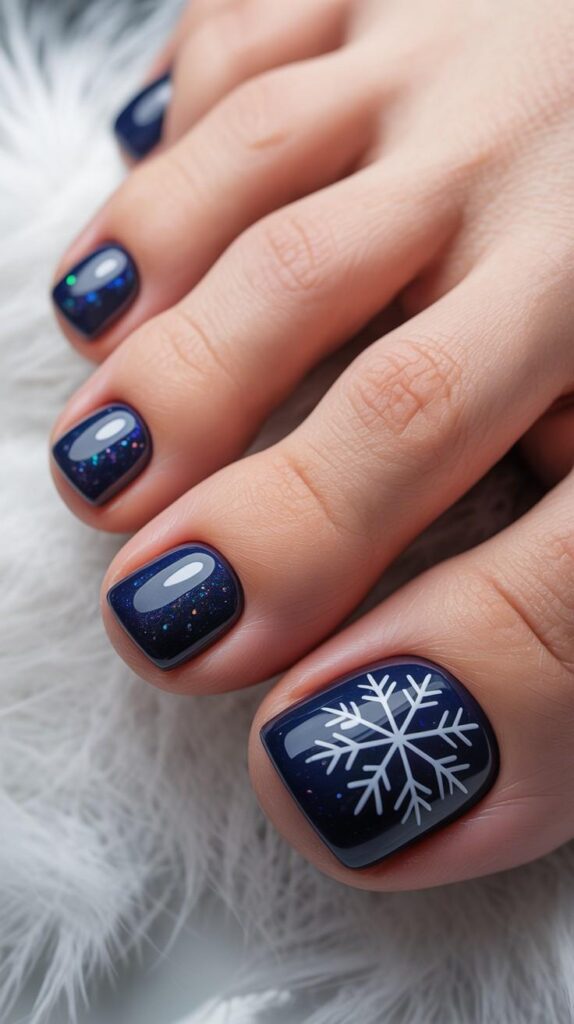 Deep navy blue polish shimmers with cosmic glitter, while one accent toe features a bold white snowflake — like a starry winter night captured in miniature. The glossy finish catches every glint of light, making it perfect for evening events or snowy strolls.