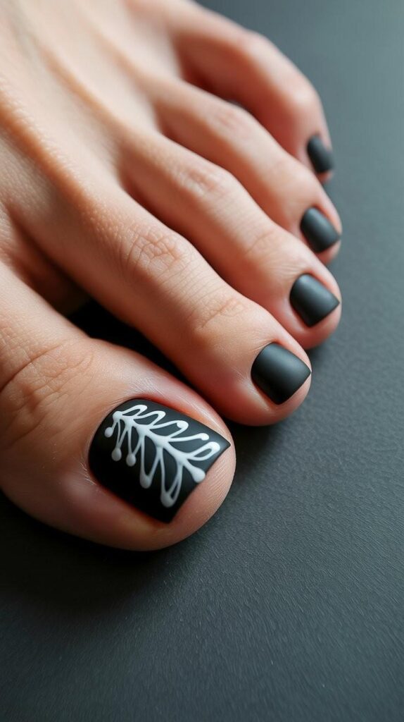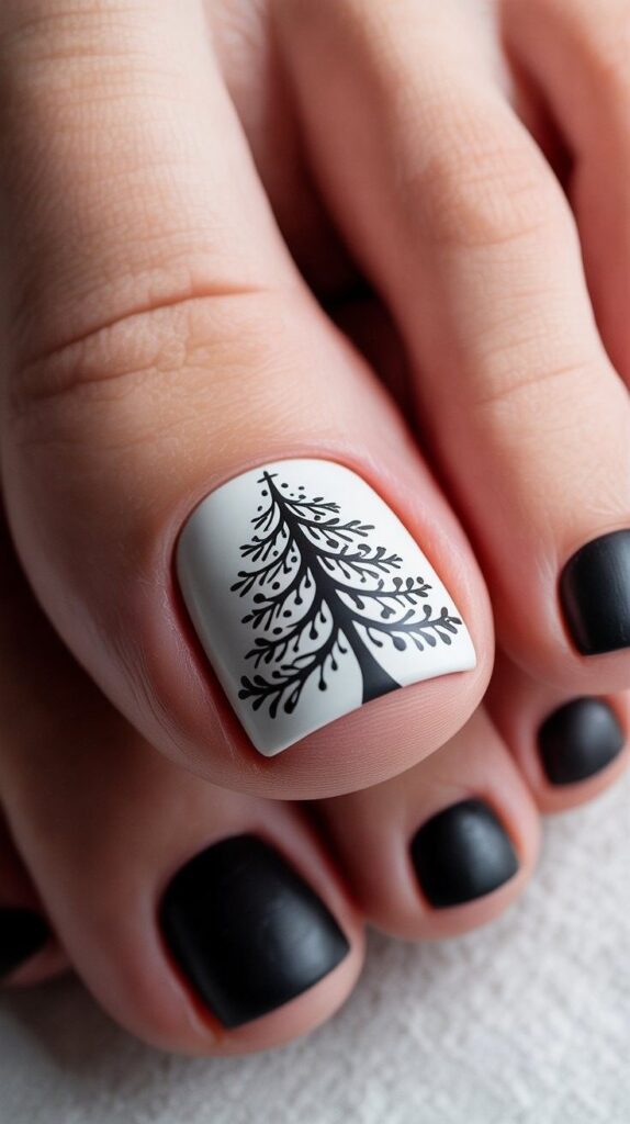 Clean matte black polish meets crisp white branch patterns — modern, chic, and perfect for showing off your winter boots. The minimalist base lets the design shine, while the matte finish gives it a sleek, edgy vibe — ideal for brides who love contrast.