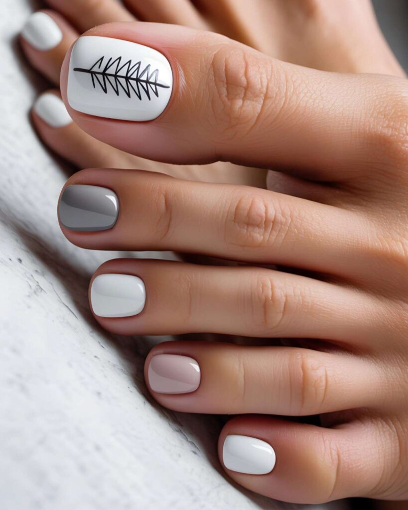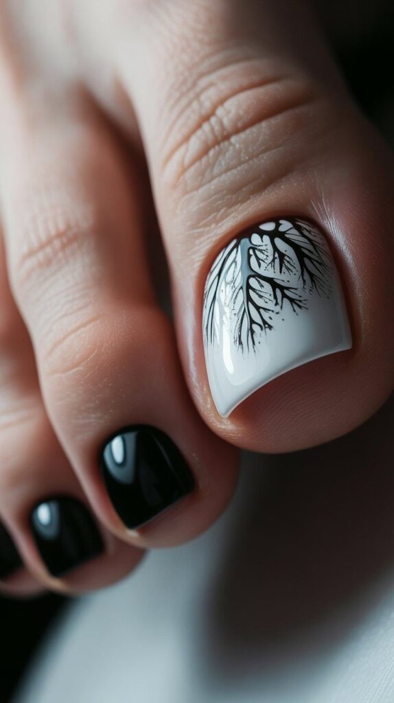 Clean white polish meets crisp black tree branches — like a winter forest captured in miniature. The matte-to-glossy gradient adds depth, while the minimalist base lets the design shine. Paired with a dark backdrop, this design whispers ‘minimalist magic’ with every step.