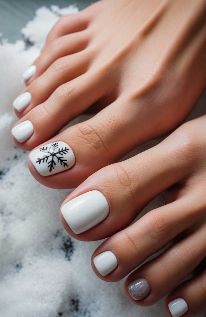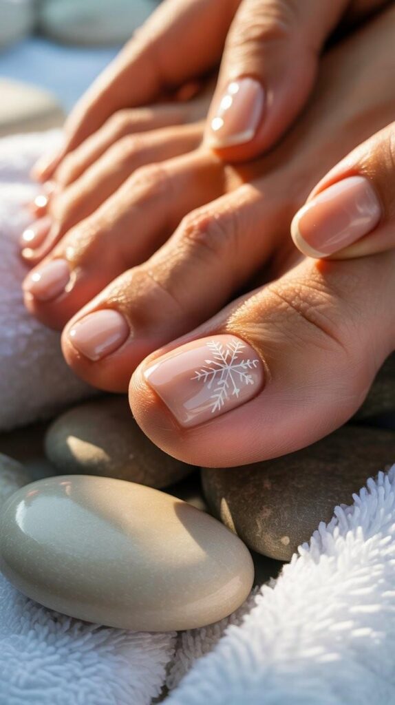 Soft nude polish meets crisp white tips, but here’s the twist: one toe features a delicate white snowflake — modern, chic, and perfect for showing off your winter boots. The glossy finish catches every glint of light, making it ideal for spa days or quiet evenings at home.