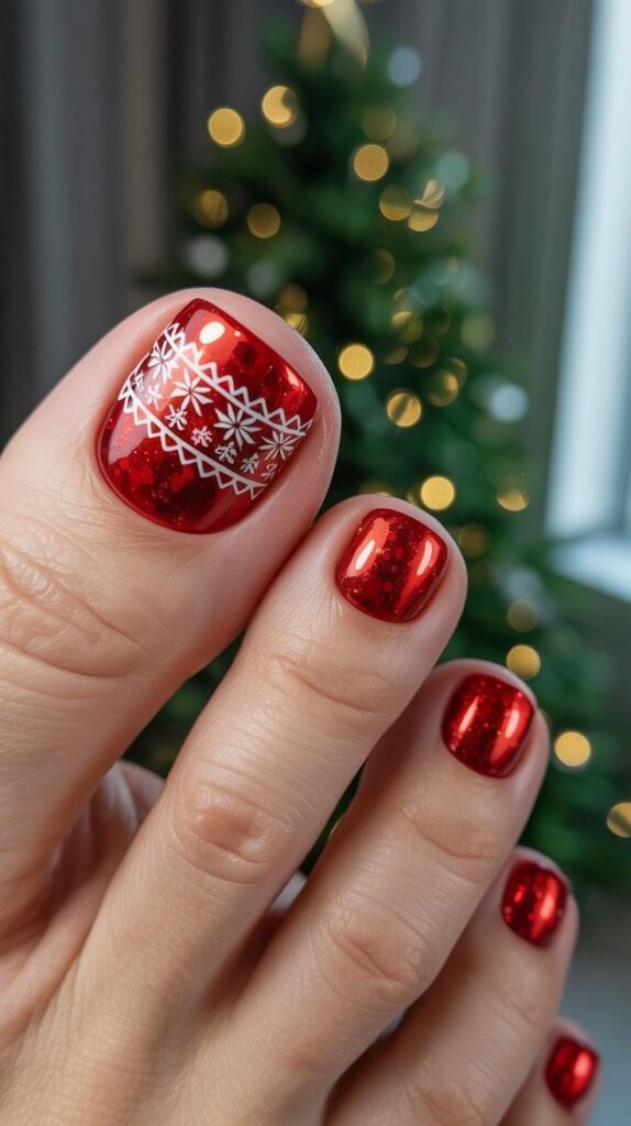 Vibrant red glitter polish meets crisp white snowflake patterns — like a cozy Christmas sweater painted on your toes. The glossy finish catches every glint of light, making it perfect for holiday parties or winter getaways. Paired with a twinkling tree backdrop, this design whispers ‘festive magic’ with every step.