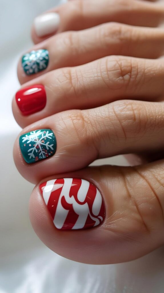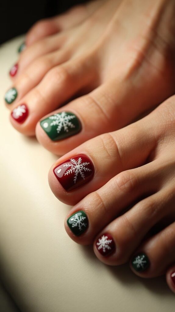 Vibrant red and deep green polish meet crisp white snowflakes — like a cozy Christmas sweater painted on your toes. The glossy finish catches every glint of light, making it perfect for holiday parties or winter getaways. Paired with a soft cream backdrop, this design whispers ‘festive magic’ with every step.