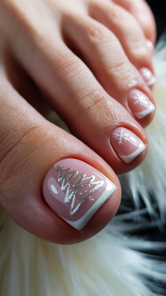 Soft blush pink meets crisp white tips, but here’s the twist: one toe features a hand-painted silver Christmas tree with delicate glitter accents — playful, romantic, and perfect for showing off your winter boots. The glossy finish makes it pop without overpowering your look.
