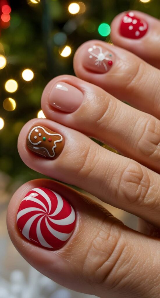 Soft nude polish meets sculpted gingerbread men and peppermint swirls — like a holiday dessert table come to life. The glossy finish catches every glint of light, making it perfect for Christmas Eve dinners or winter getaways. Paired with twinkling tree lights, this design whispers ‘festive glam’ with every step.