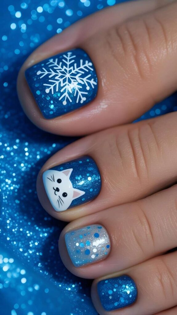 Vibrant blue glitter polish meets a playful white cat face peeking out from one toe — like a cozy winter pet curled up by the fire. The glossy finish catches every glint of light, making it perfect for holiday photos or festive gatherings.