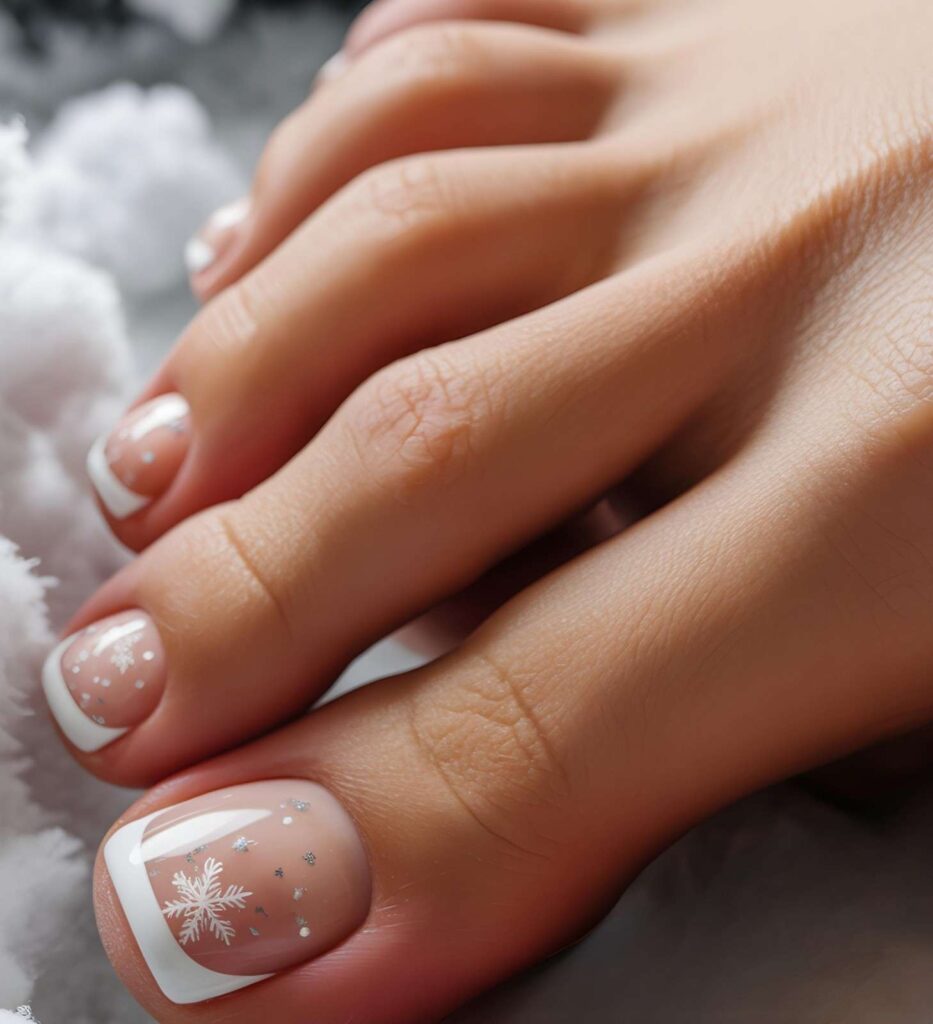 Soft nude polish meets crisp white tips, but here’s the twist: one toe features a delicate silver snowflake — modern, chic, and perfect for showing off your winter boots. The glossy finish catches every glint of light, making it ideal for spa days or quiet evenings at home.