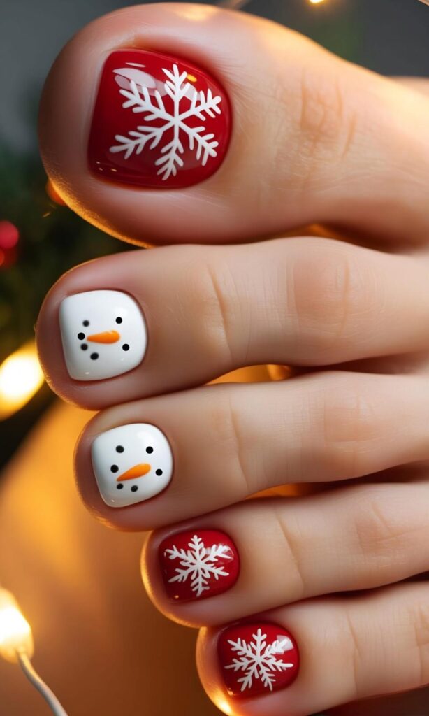Crisp white snowmen with carrot noses peek out from two toes, paired with bold red snowflakes on others — playful, romantic, and perfect for showing off your winter boots. The glossy finish makes it pop, ideal for family gatherings or cozy Christmas mornings.