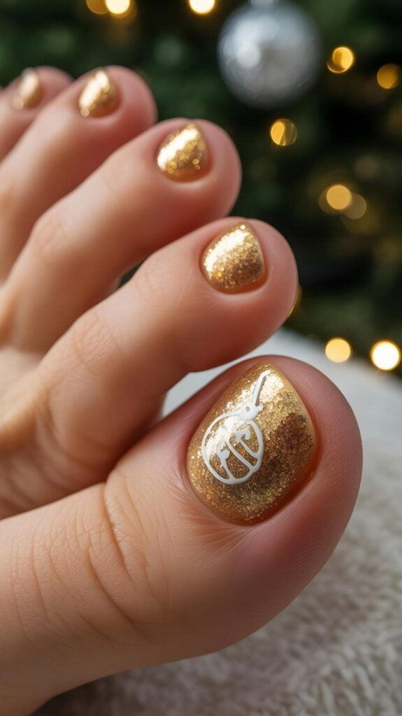 Rich gold glitter polish meets a sculpted white ornament — like a holiday gift box come to life. The glossy finish catches every glint of light, making it perfect for evening events or snowy strolls. Paired with twinkling tree lights, this design whispers ‘luxury magic’ with every step.