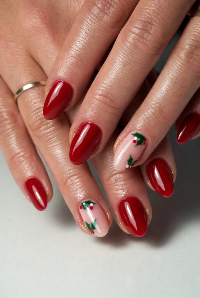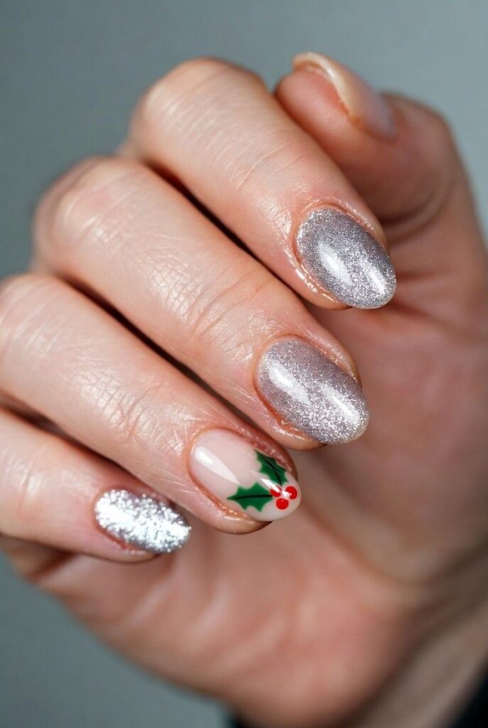 “Soft nude nails meet holiday glam with a silver glitter accent nail and a single holly leaf with red berries on another finger. The rest? Clean, classic, and totally low-key — elegant, understated, and perfect for everyday wear.”
