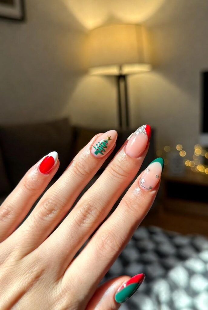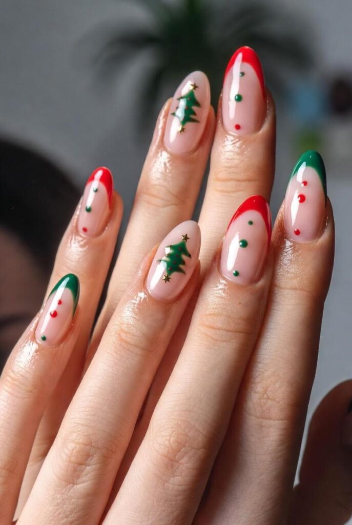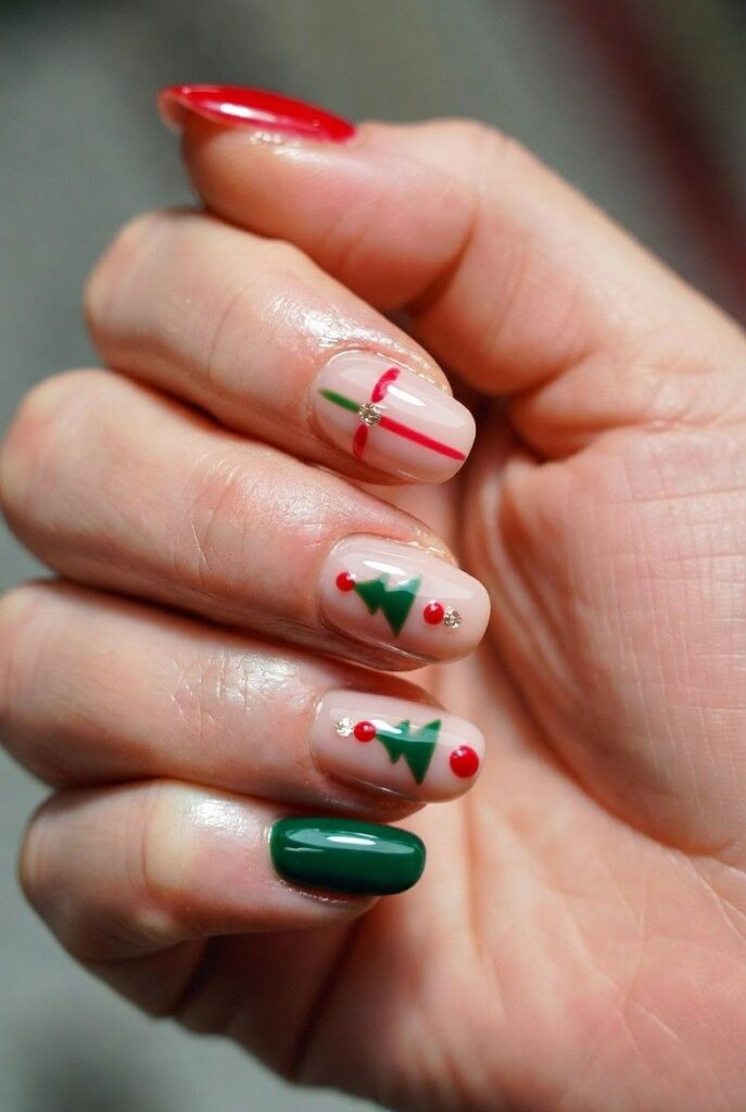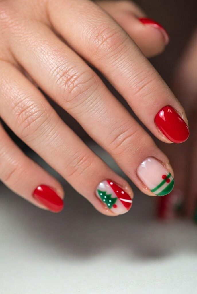 “Soft nude nails get a cheerful upgrade with glossy red tips and a tiny green Christmas tree with red ornaments on one finger — plus a red-and-white striped accent nail. It’s simple, bold, and totally festive — like wearing a holiday gift box on your fingertips.”