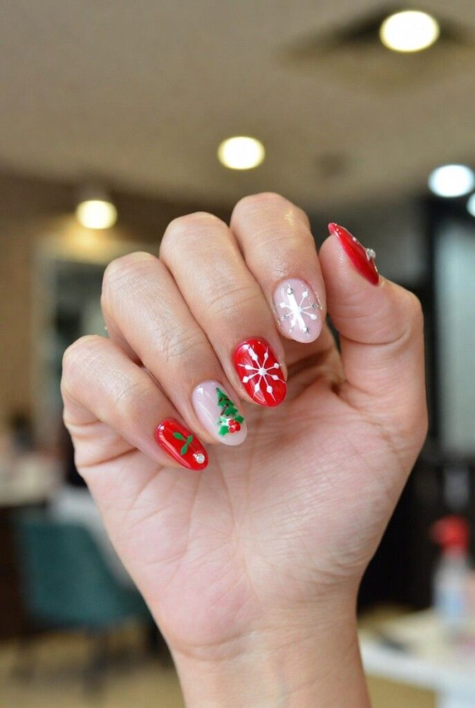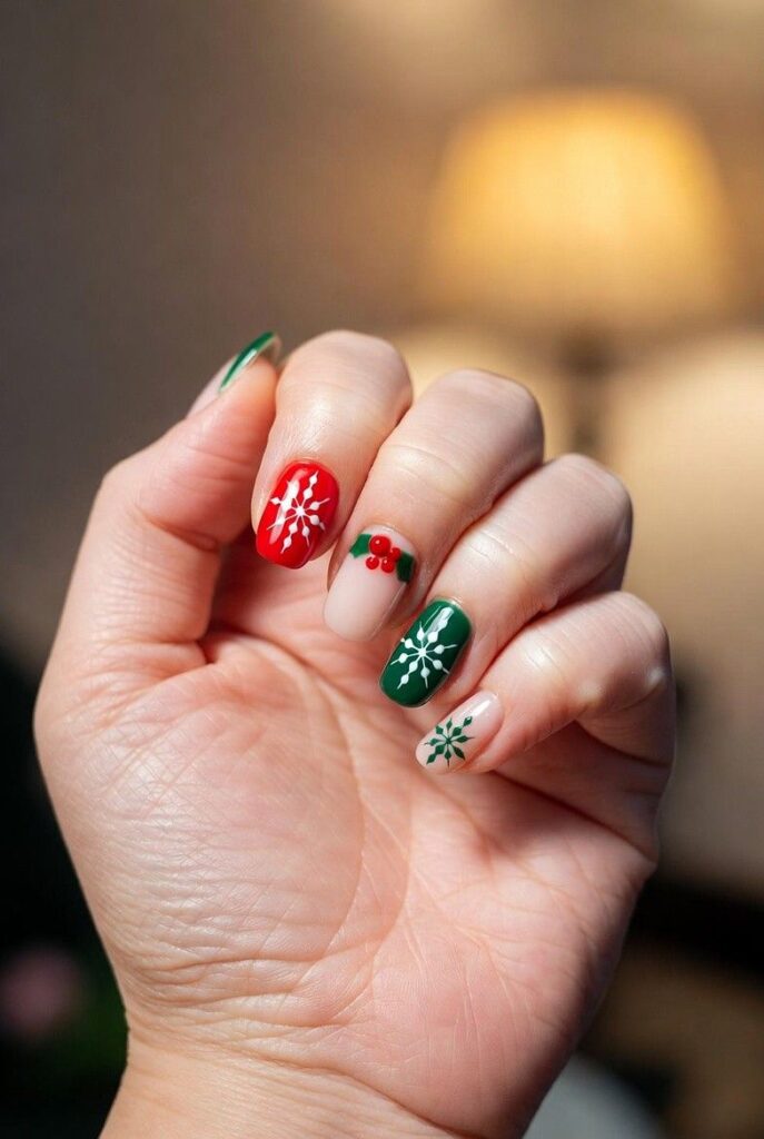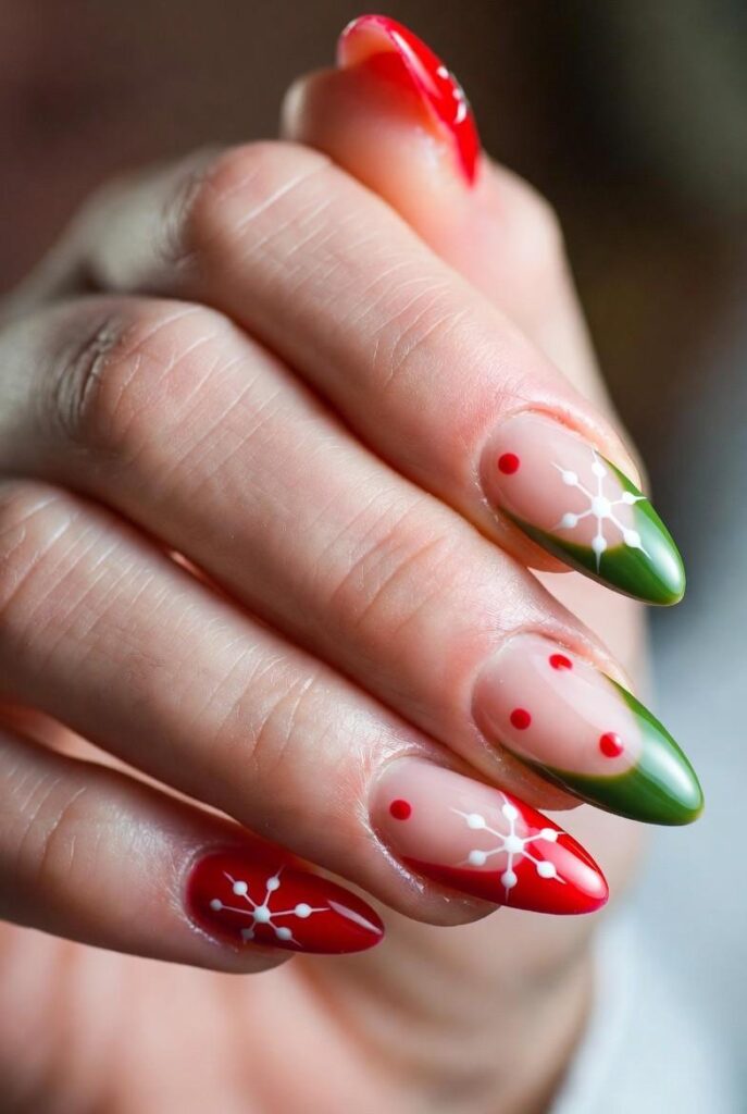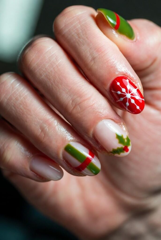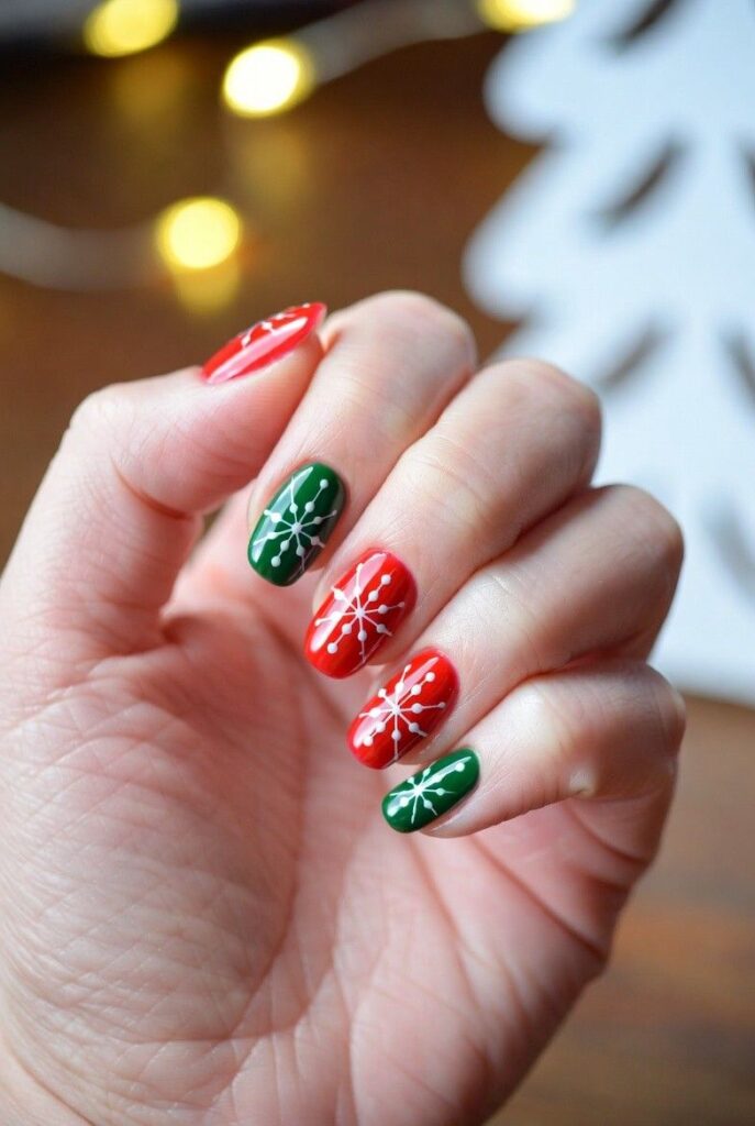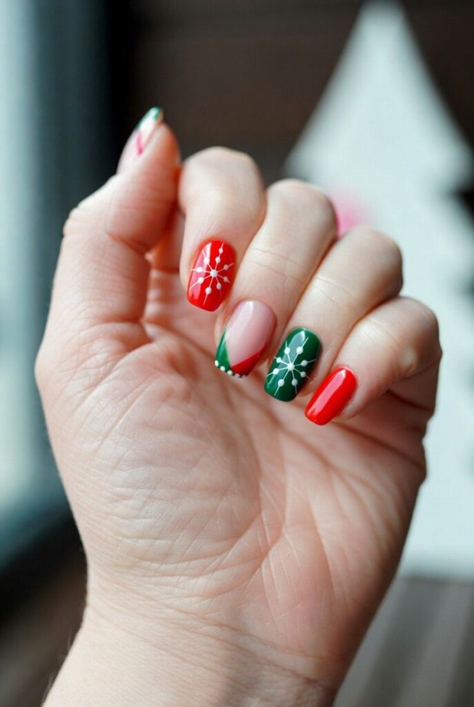 “Glossy red and green nails get a festive upgrade with delicate white snowflakes and red-and-green stripes — simple, bold, and totally festive. It’s like your nails are ready for a holiday parade — fun, flirty, and packed with joy.”
