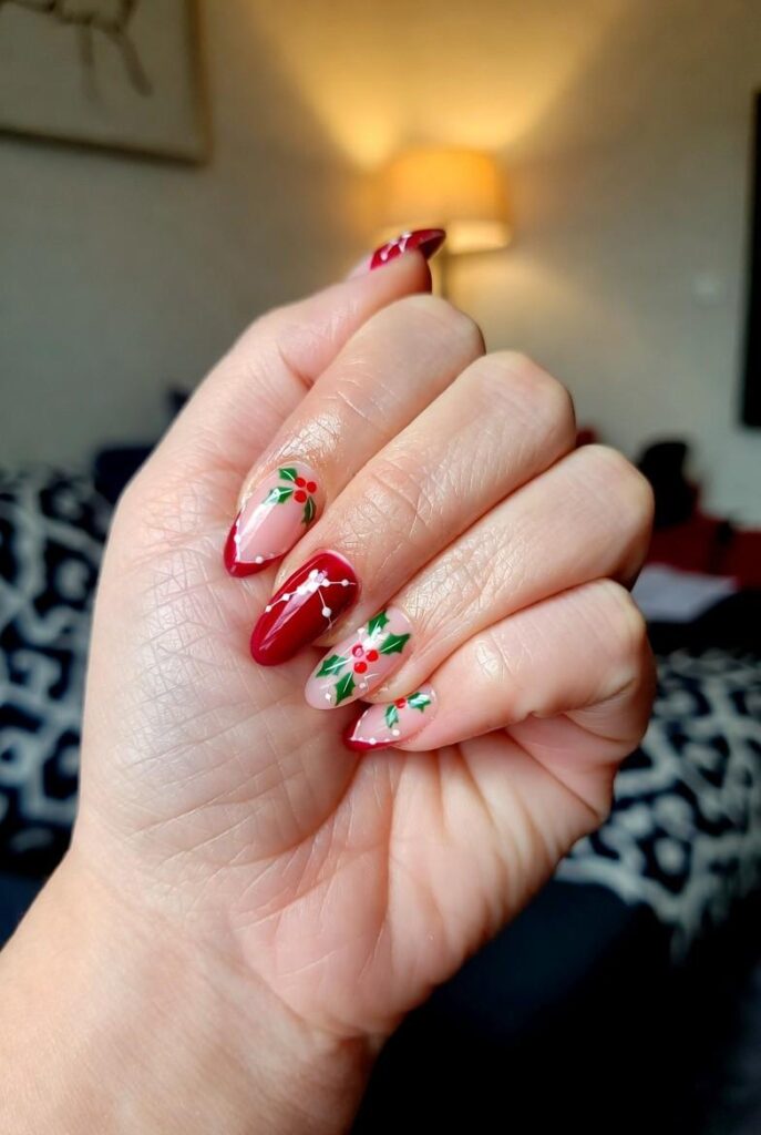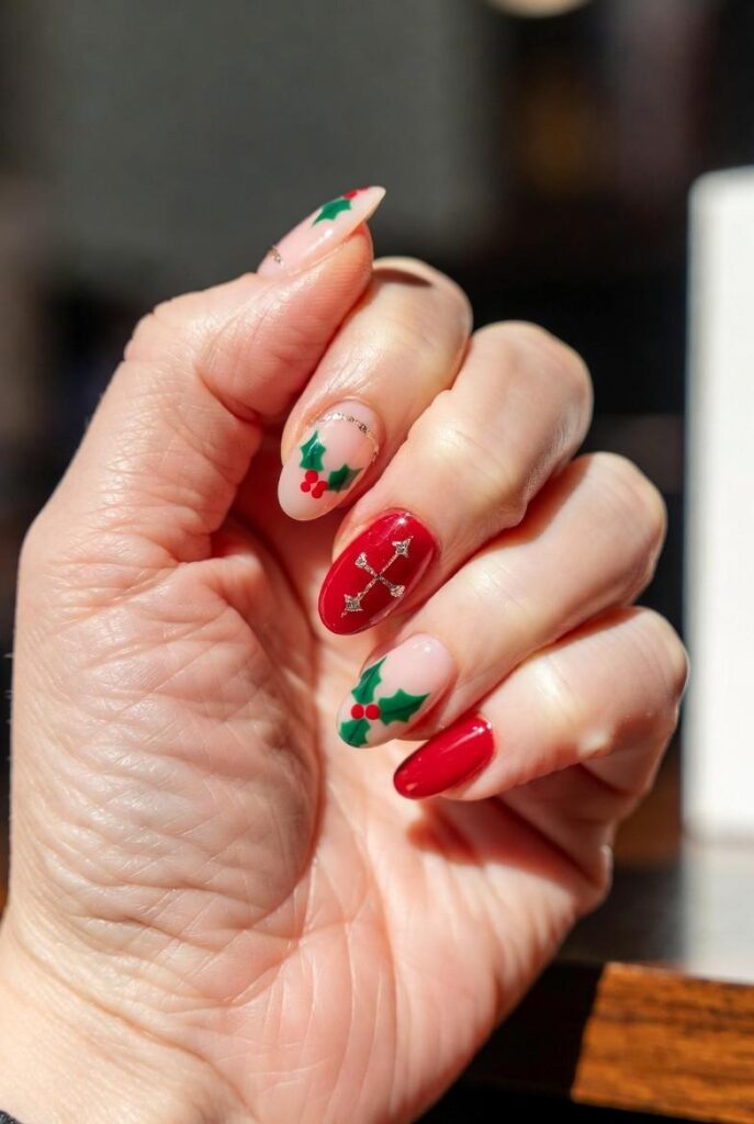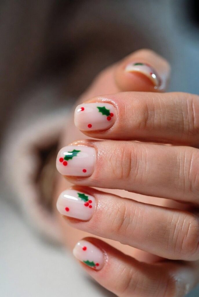“Soft nude nails get a cheerful upgrade with tiny holly leaves with red berries — simple, bold, and totally festive. It’s like your nails are ready for a holiday parade — fun, flirty, and packed with joy.”