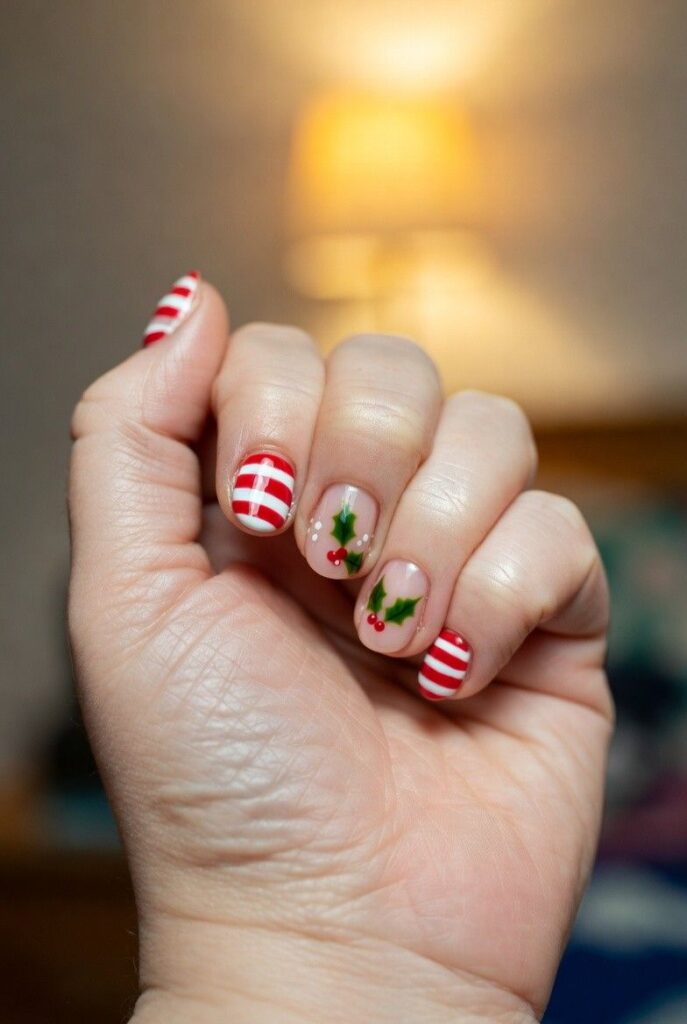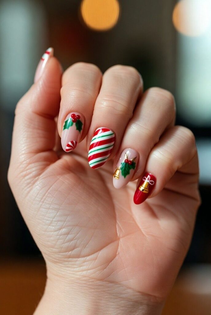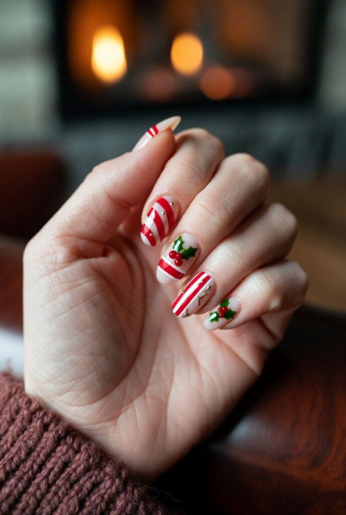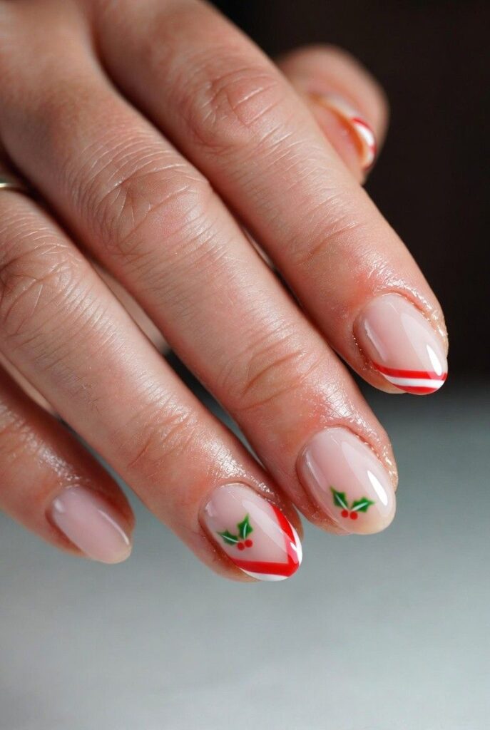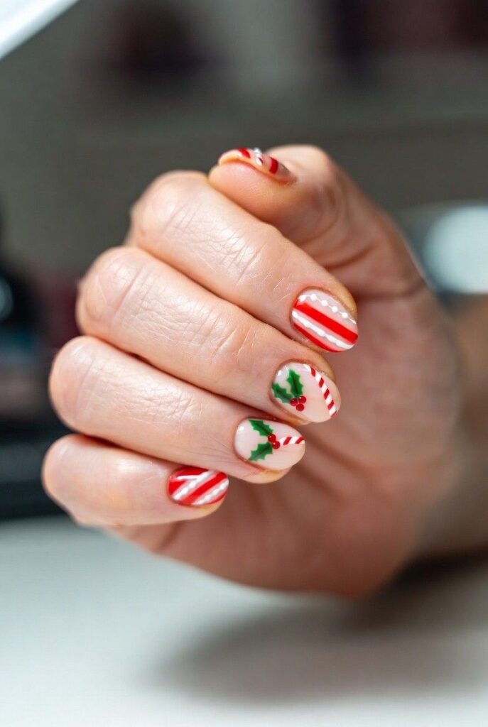 “Soft nude nails get a festive twist with red-and-white candy cane stripes and tiny holly leaves with red berries — simple, bold, and totally festive. It’s like your nails are ready for a holiday parade — fun, flirty, and packed with joy.”