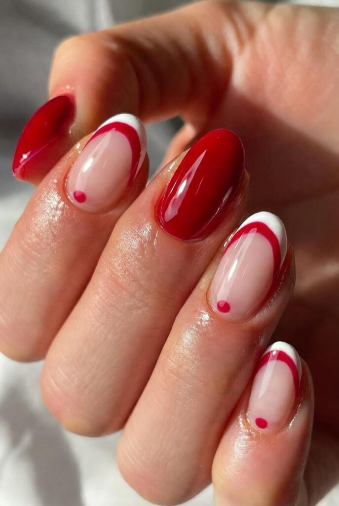 “Soft nude nails meet holiday glam with glossy red tips and a single pink dot on each accent nail — simple, elegant, and totally wearable. It’s like wearing a holiday gift box on your fingertips — sweet, serene, and perfect for everyday wear.”