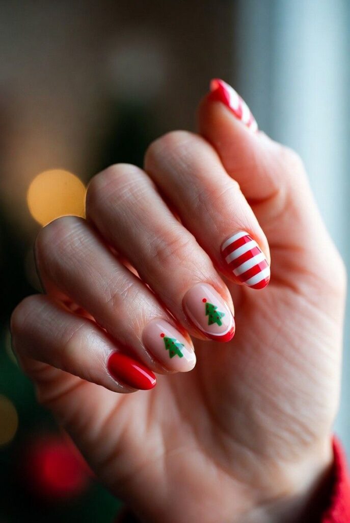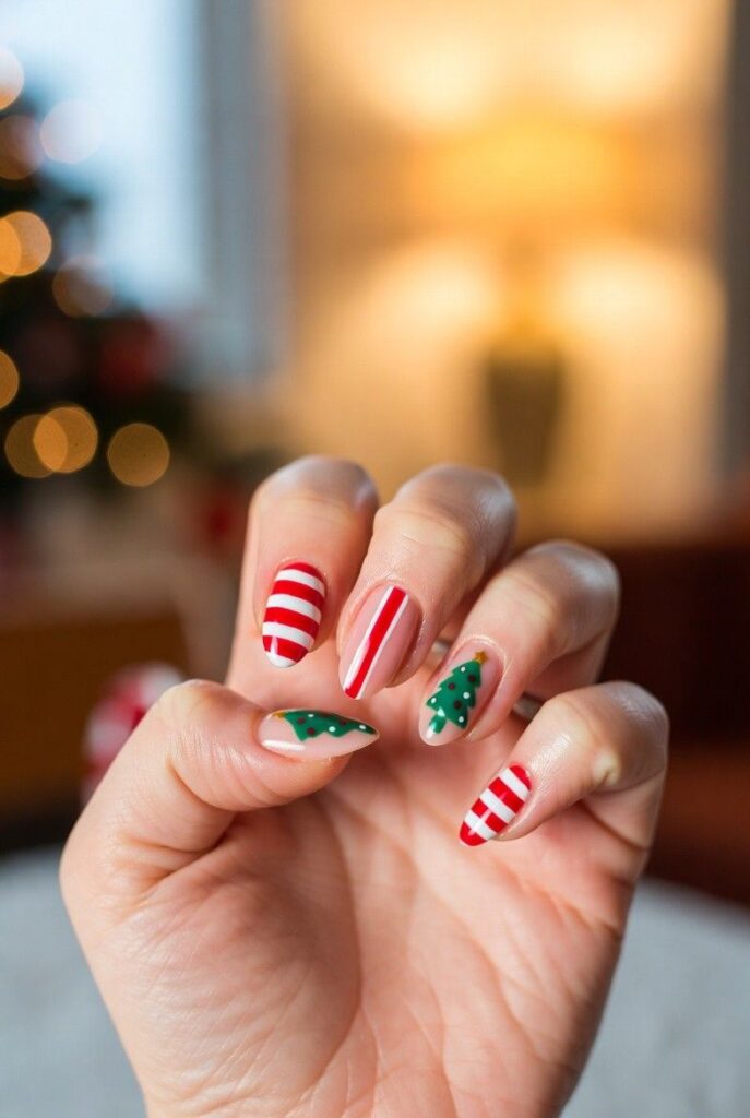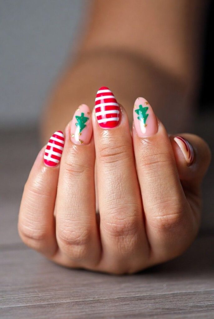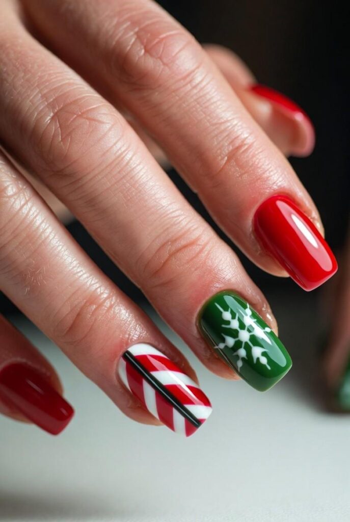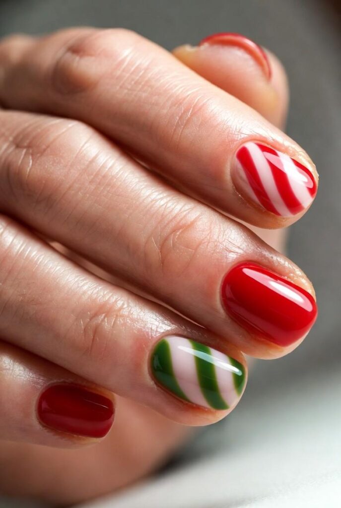 “Glossy red and green nails get a festive upgrade with red-and-white and green-and-white stripes — simple, bold, and totally festive. It’s like your nails are ready for a holiday parade — fun, flirty, and packed with joy.”