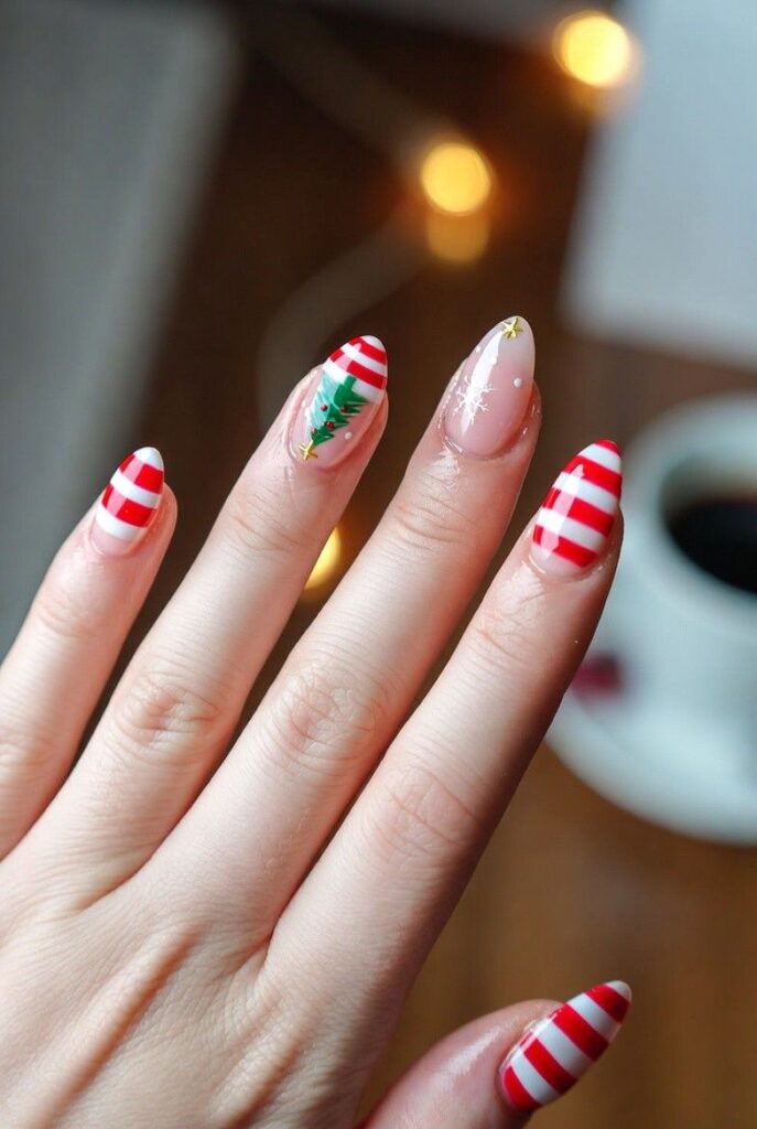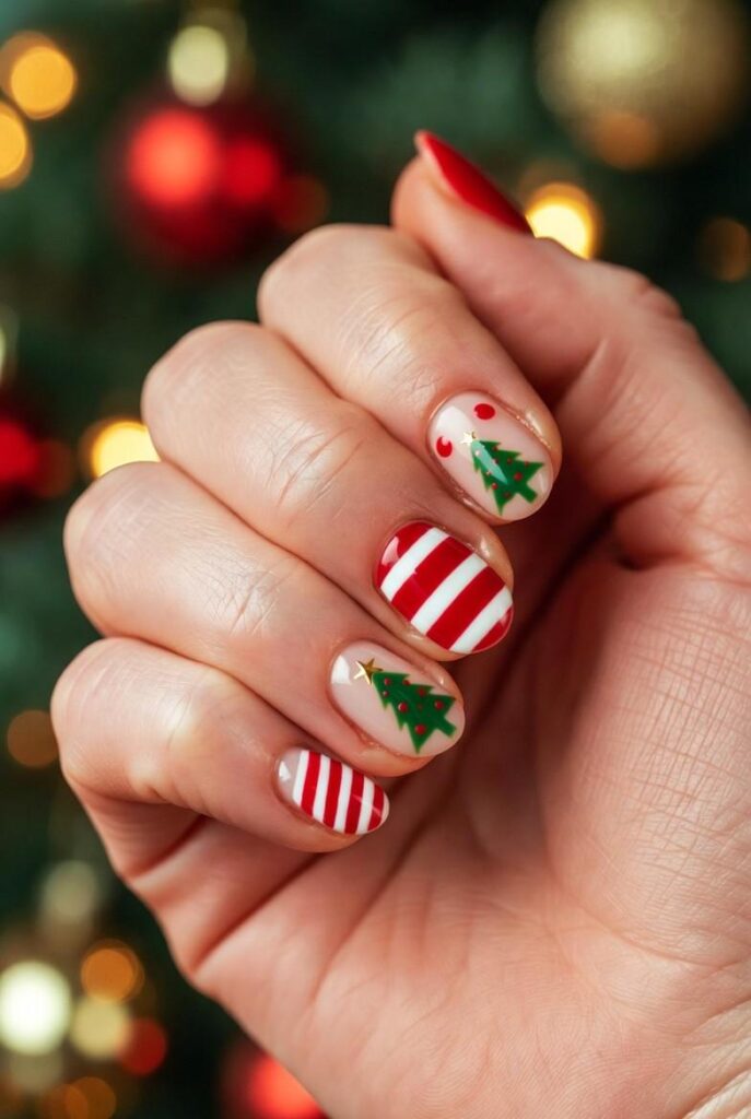 “Glossy red-and-white candy cane stripes alternate with tiny green Christmas trees topped with gold stars — simple, bold, and totally festive. It’s like your nails are ready for a holiday parade — fun, flirty, and packed with joy.”