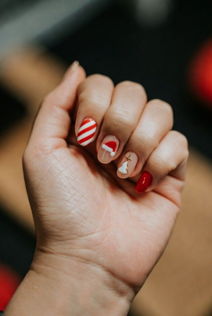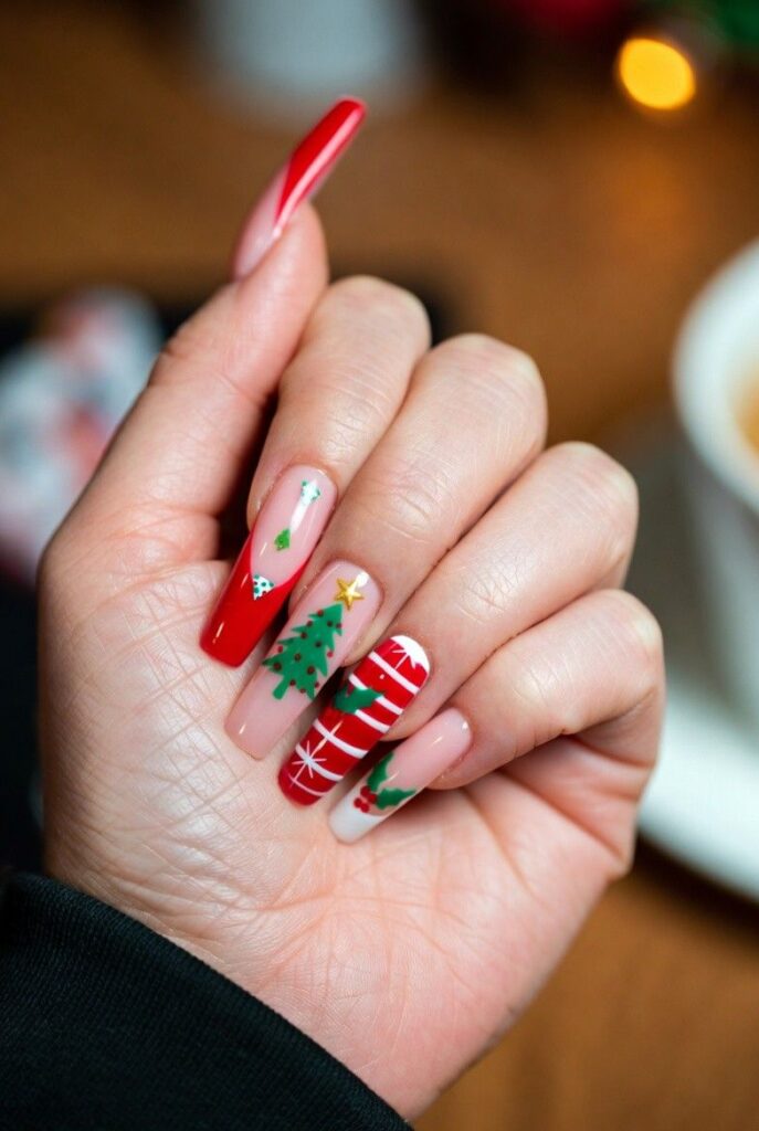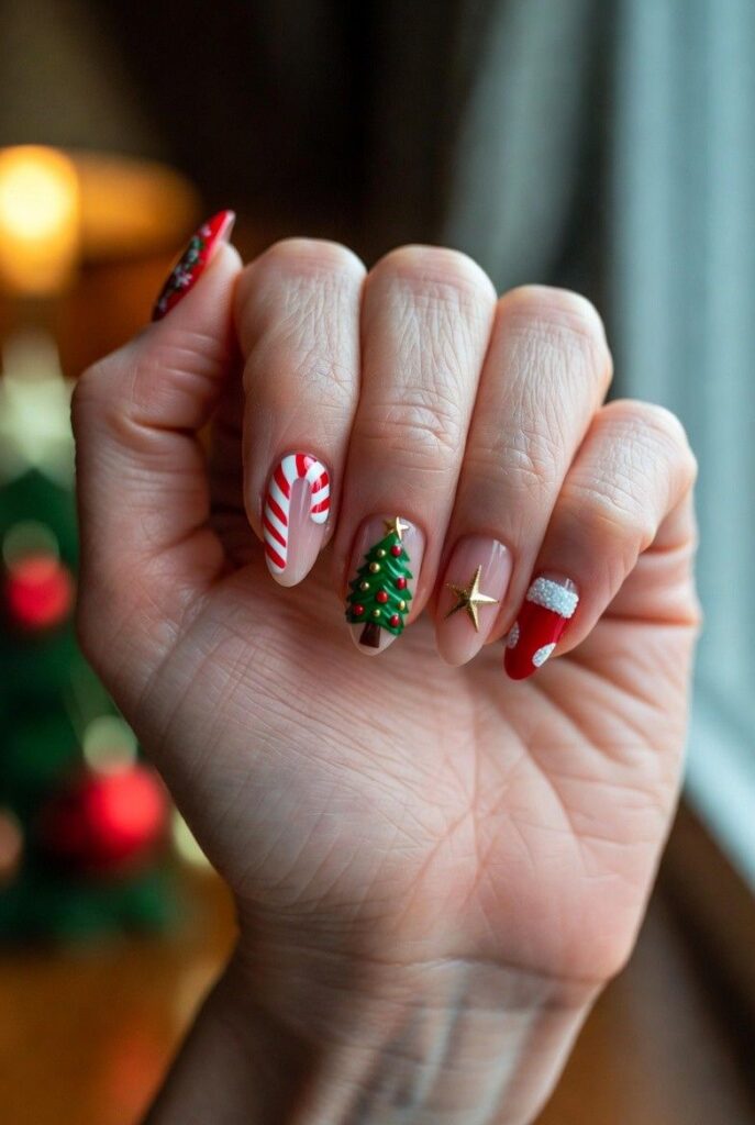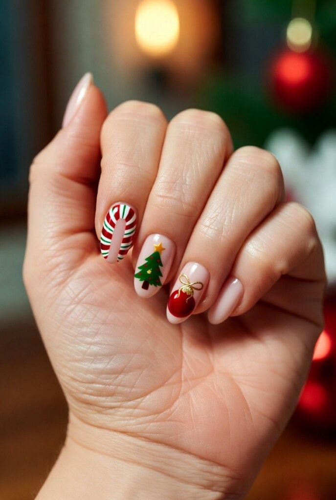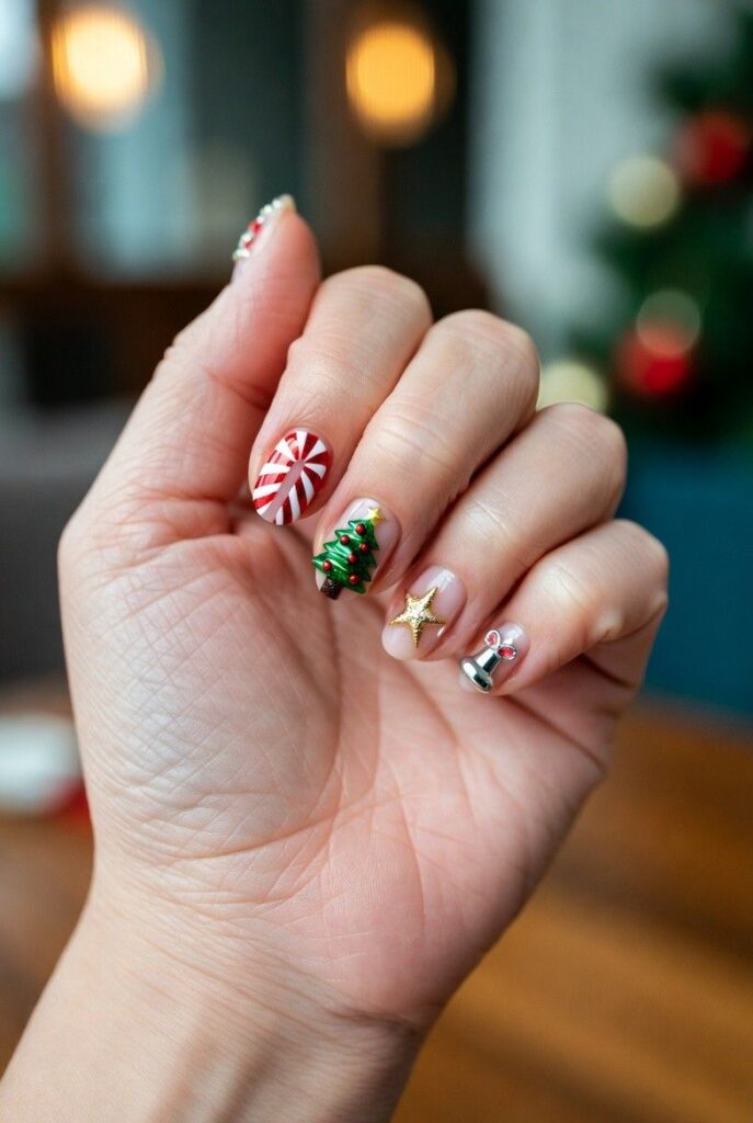 “Soft nude nails get a festive upgrade with a red-and-white candy cane, a tiny green Christmas tree with red ornaments, and a gold star — all clustered together like a little holiday scene. It’s playful, classic, and totally Instagram-worthy — like wearing a Christmas card on your fingertips.”