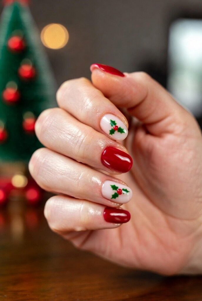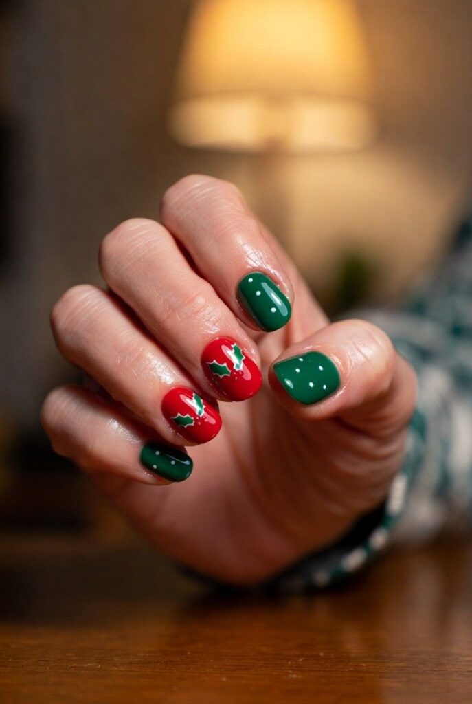 “Glossy red and green nails meet holiday charm with tiny holly leaves with red berries — simple, elegant, and totally wearable. It’s like wearing a holiday gift box on your fingertips — sweet, serene, and perfect for everyday wear.”