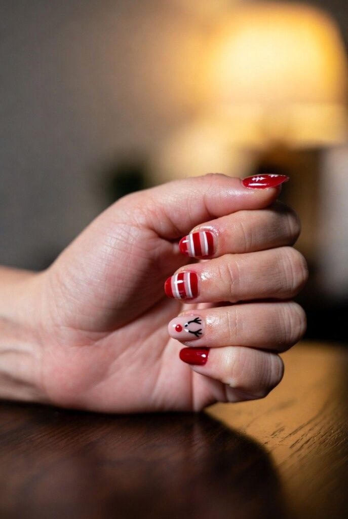 “Glossy red nails meet holiday charm with red-and-white candy cane stripes and a cute reindeer with a red nose — both perched on a soft nude base. The rest? Clean, classic, and totally low-key — sweet, serene, and perfect for everyday wear.”
