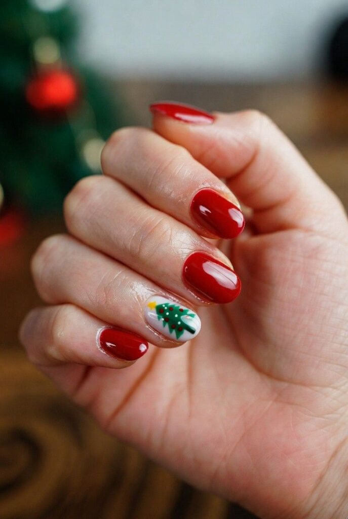 “Glossy red nails meet holiday charm with a tiny hand-painted Christmas tree topped with a gold star — surrounded by tiny gold dots that look like twinkling lights. The rest? Clean, classic, and totally low-key — chic, understated, and perfect for everyday wear.”