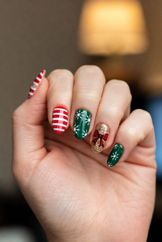 “A cheerful mix of red-and-white candy cane stripes, deep green snowflakes, and a glittery gold accent nail with a bold red bow. It’s playful, classic, and totally Instagram-worthy — like wearing a holiday gift box on your fingertips.”