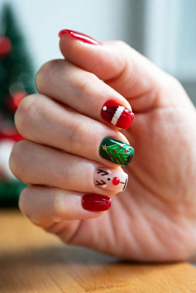 “Glossy red nails get a playful upgrade with a tiny white Santa hat, a green Christmas tree topped with a gold star, and a cute reindeer with a red nose — all clustered together like a little holiday scene. It’s sweet, whimsical, and totally Instagram-worthy — like wearing a Christmas card on your fingertips.”