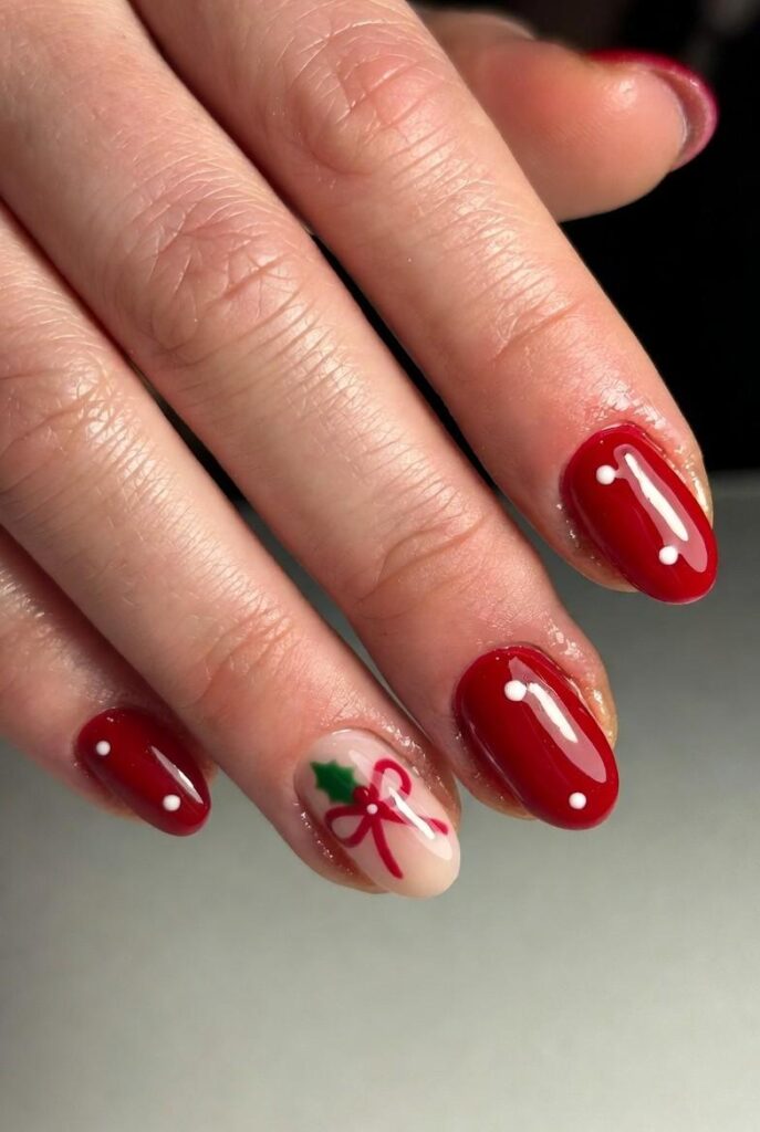 “Soft nude nails meet holiday glam with glossy red tips and a delicate red bow with holly leaves on one finger — simple, elegant, and totally wearable. It’s like wearing a holiday gift box on your fingertips — sweet, serene, and perfect for everyday wear.”
