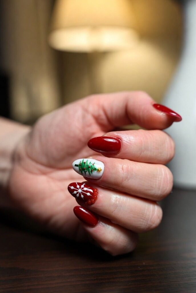 “Glossy red nails get a festive twist with a tiny green Christmas tree with red ornaments on one finger — simple, elegant, and totally wearable. It’s like wearing a holiday gift box on your fingertips — sweet, serene, and perfect for everyday wear.”