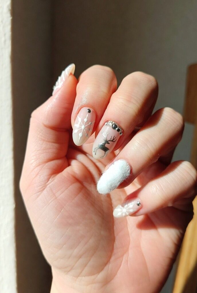 “Soft nude nails get a winter upgrade with delicate white snowflakes, a tiny silver reindeer silhouette, and a fluffy white accent nail that looks like it’s been dusted with real snow. Tiny rhinestones add just enough sparkle to catch the light — sweet, serene, and totally wearable.”
