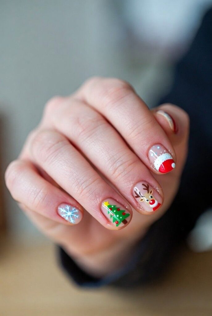 “Soft nude nails get a winter upgrade with a delicate white snowflake, a tiny green Christmas tree, and a cute reindeer with a red nose — all perched on a soft nude base. Tiny rhinestones add just enough sparkle to catch the light — sweet, serene, and totally wearable.”