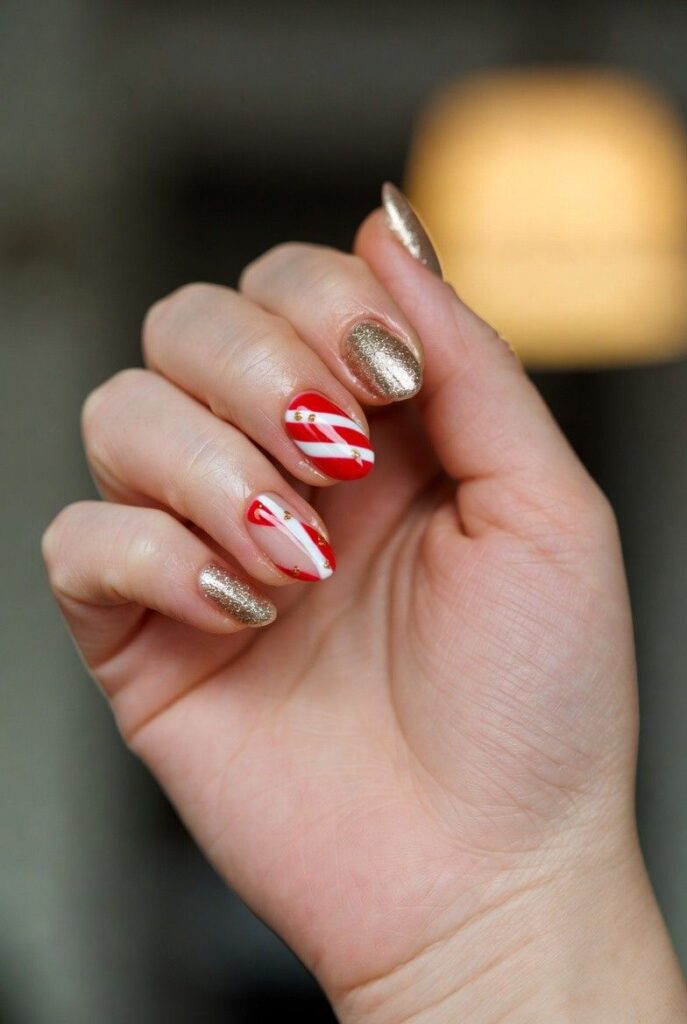 “Soft nude nails meet holiday glam with a gold glitter accent nail and red-and-white candy cane stripes on the others — simple, elegant, and totally photo-ready. Tiny gold dots scattered across the stripes add just enough sparkle to catch the light — chic, understated, and perfect for everyday wear.”