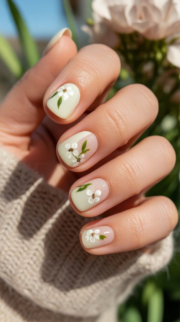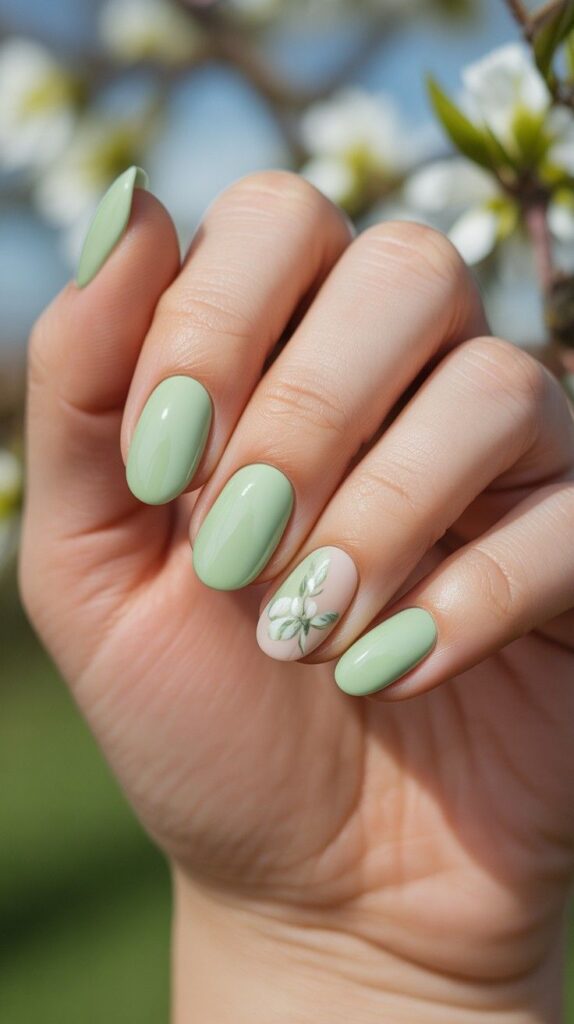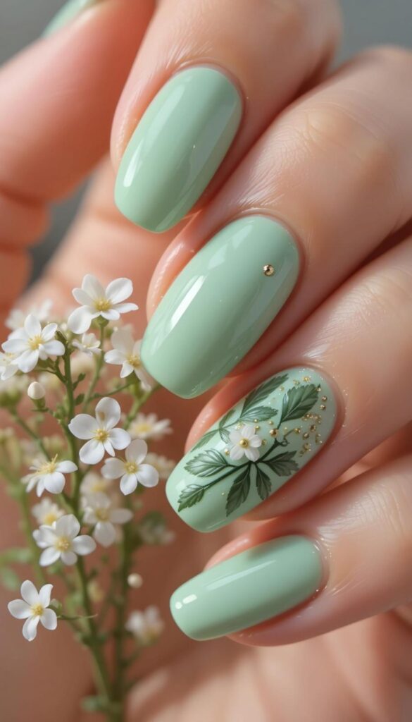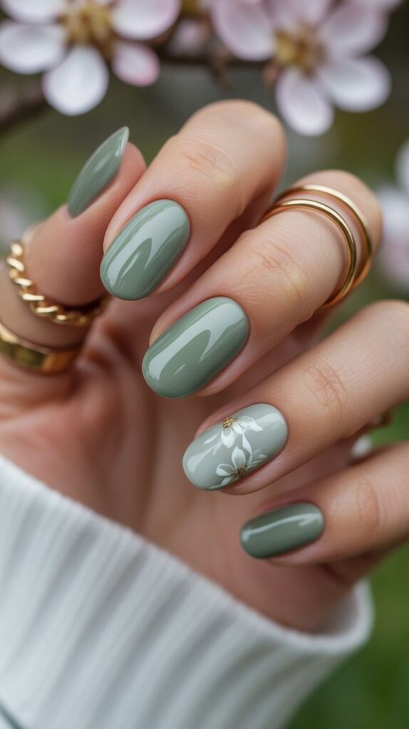 Glossy short almond nails in soft sage, two accent fingers with white blossoms + green leaves + gold dots. High-shine, elongated shape. Poetic, earthy, grounding—like forest mist at dawn.