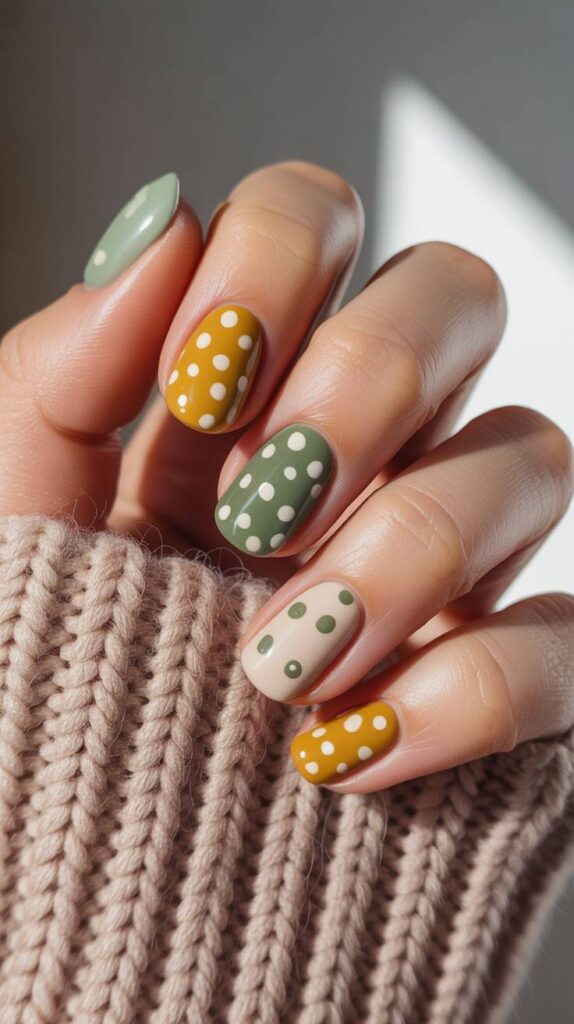 Sheer nude short squoval nails, mustard & sage with white polka dots. Glossy, compact shape. Playful, cheerful, celebratory—like confetti caught in morning light.