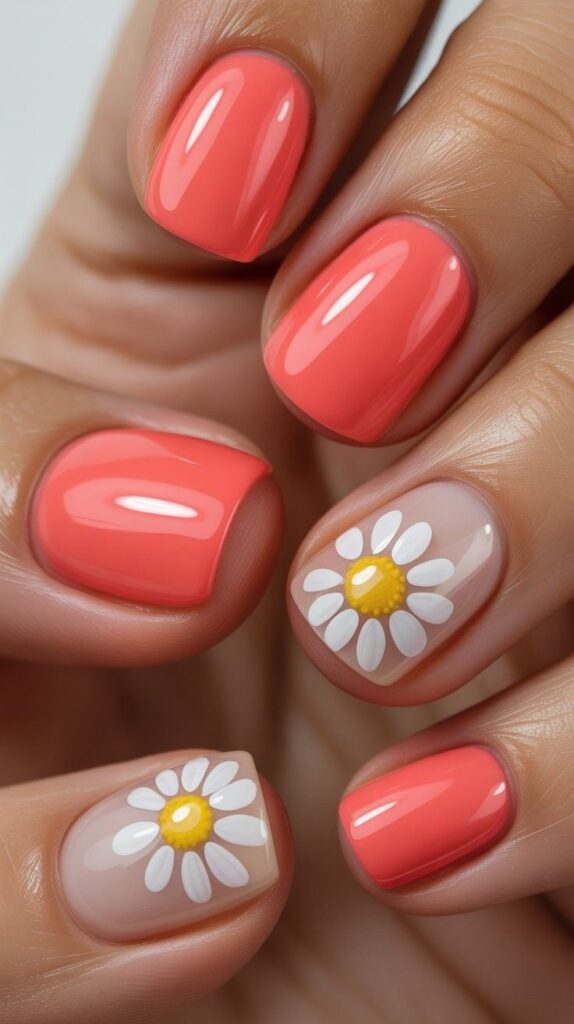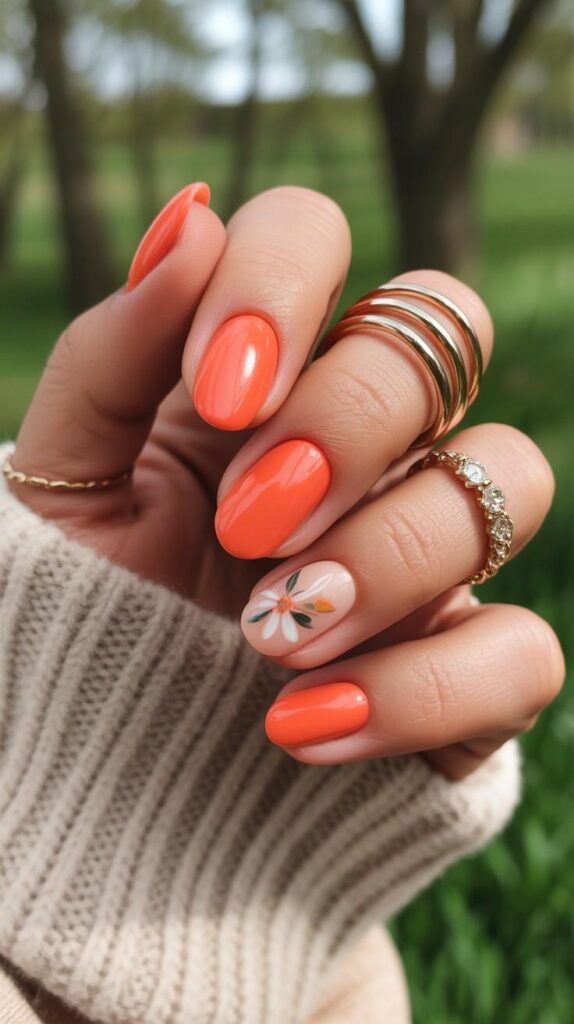 Glossy short almond nails in vibrant coral finish, two accent fingers featuring hand-painted white daisies (yellow centers) and fine green vine details. The high-shine surface makes the color glow like sunset light, and the elongated shape flatters every hand. Bold, clean, and full of joyful simplicity—like a fresh start, polished and proud.