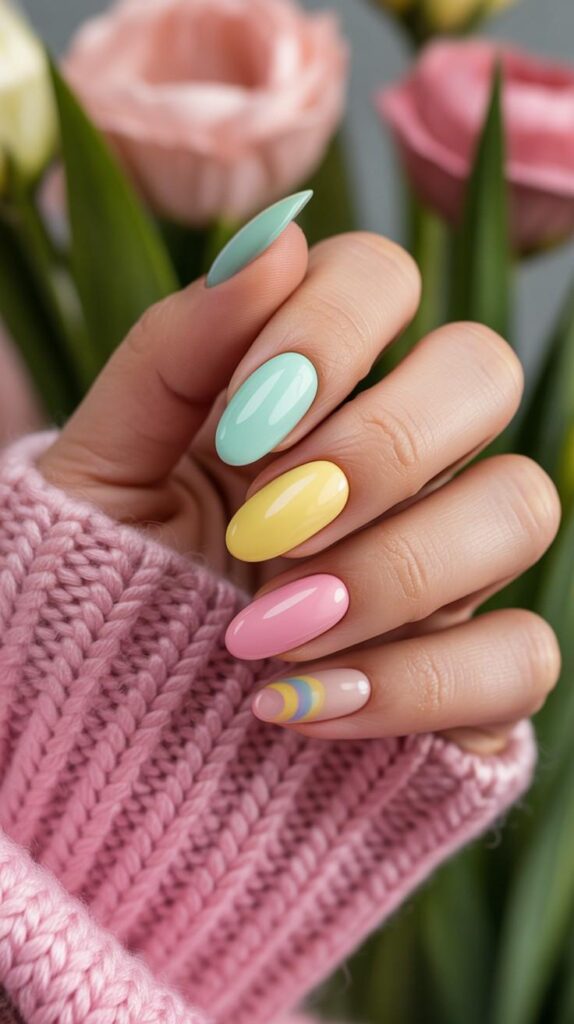 Short oval nails in mint → lemon → blush-pink gradient. Glossy, oval shape. Gentle, harmonious, calming—like light filtering through new growth.