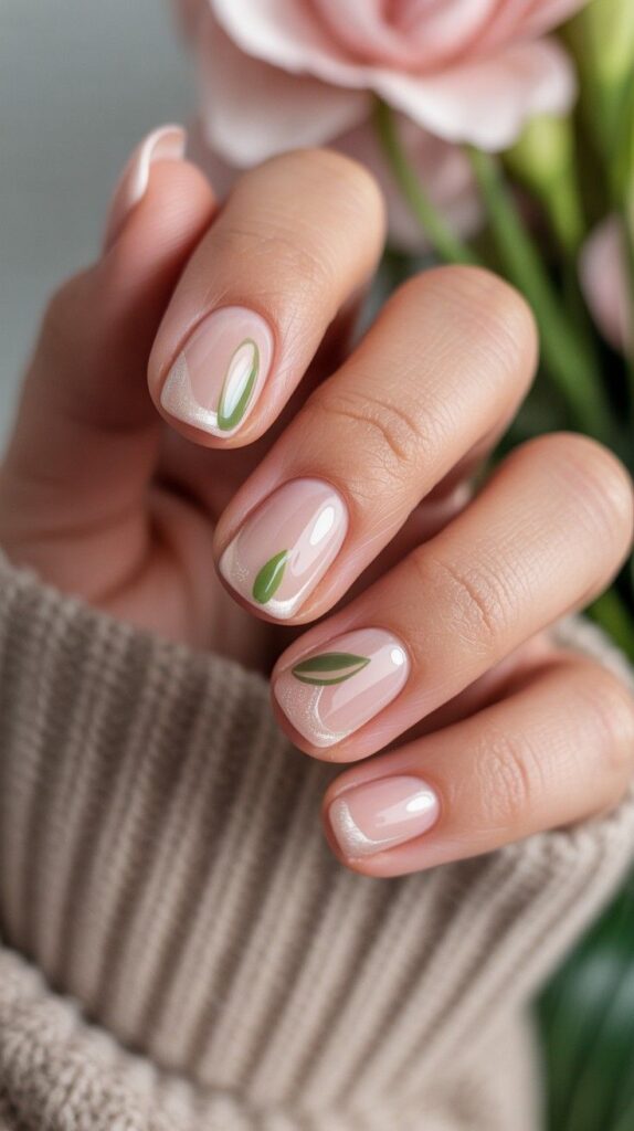 Sheer nude short oval nails, two accent fingers adorned with a single hand-painted green leaf (matte finish) on glossy nude—clean, intentional, and deeply grounding. The contrast between textures creates quiet drama, and the oval shape ensures comfort and elegance. Serene, modern, and full of quiet strength—like stillness before the storm breaks into light.