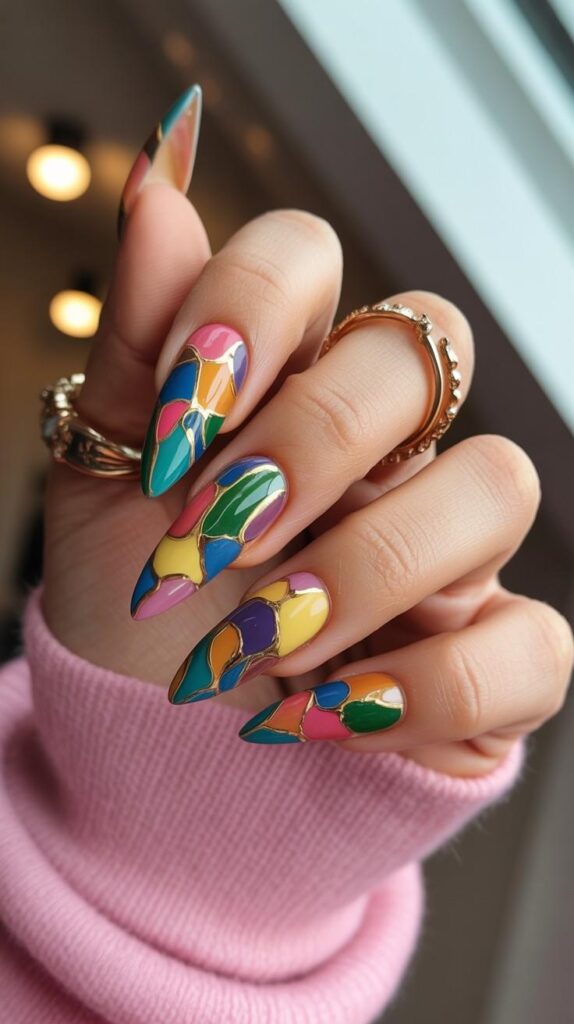 Glossy long stiletto nails in nude base, featuring geometric floral segments in coral, turquoise, violet, and lemon—bordered by fine gold line-art. High-shine, sharp silhouette. Bold, luminous, deeply intentional—like light through cathedral windows, reimagined.