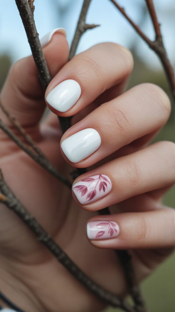 Glossy short square nails in ivory, two with maroon leaf motifs + negative space. High-shine, crisp square. Minimalist, grounded, calming—like ink on rice paper, reimagined.