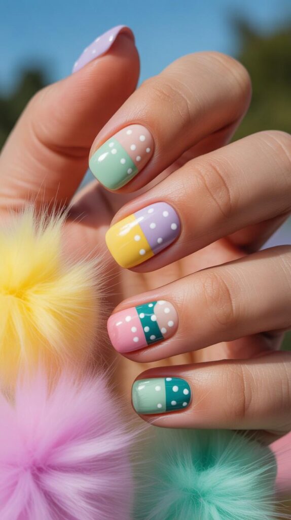 Short squoval nails in pastel blocks (mint, peach, lavender, yellow) with crisp white polka dots. High-shine, compact shape. Playful, nostalgic, joyful—like Easter eggs scattered in sunlight.