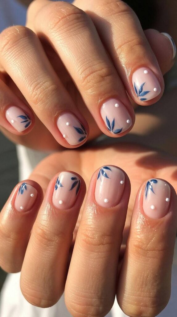 Sheer nude short squoval nails, two accent fingers featuring hand-painted fine-line blue botanical motifs—leaves, stems, and subtle dot accents—with matte-finish contrast on glossy base. The high-shine finish sharpens the detail, and the compact shape ensures all-day wearability. Minimalist, modern, and full of quiet intelligence—like ink on rice paper, softened by time.