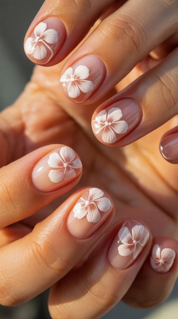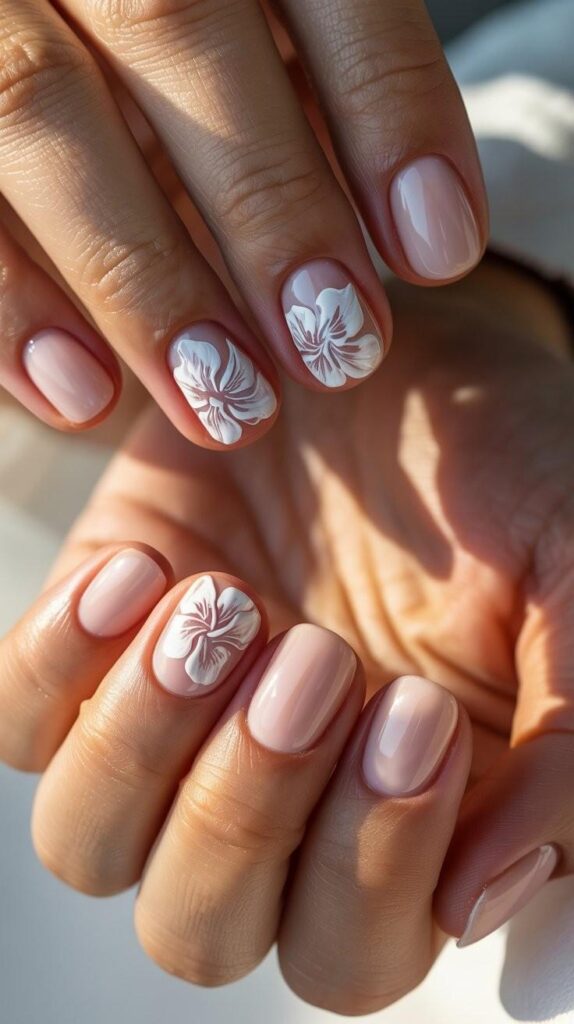 Sheer nude short oval nails, two accent fingers adorned with delicate hand-painted white floral motifs—fine black-outline petals, subtle negative-space detailing, and soft watercolor washes. The glossy finish enhances the clarity, and the oval shape ensures comfort and elegance. Minimalist, intentional, and deeply ink on parchment, softened by time.