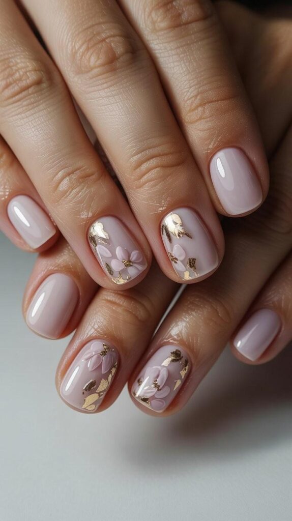 Glossy short oval nails in soft blush base, two accent fingers adorned with hand-painted miniature pink blossoms accented by delicate gold-leaf veining and micro-crystal centers. The glossy finish unifies the palette, and the oval shape ensures comfort and elegance. Luxurious, tender, and deeply intentional—joy made sacred.