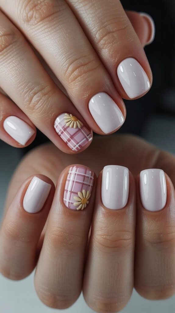 Glossy short square nails in pure ivory base, two accent fingers featuring soft pink-and-white checkered grids overlaid with a single raised 3D daisy (yellow center, gold leaf). The high-shine finish unifies the palette, and the crisp square shape ensures modern sophistication. Playful yet refined—like a vintage tea towel reimagined for the runway.