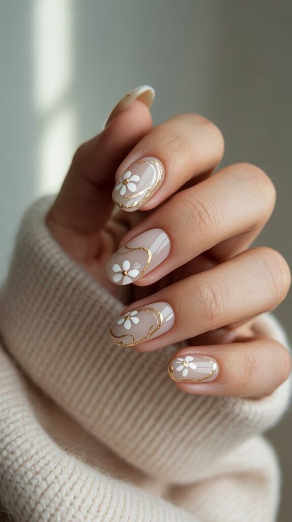 Glossy short almond nails in sheer nude, each adorned with a single hand-painted white daisy (yellow center), framed by flowing gold metallic line-art. High-shine finish, elongated shape. Minimalist, sacred, deeply intentional—like a prayer written in light and petal.