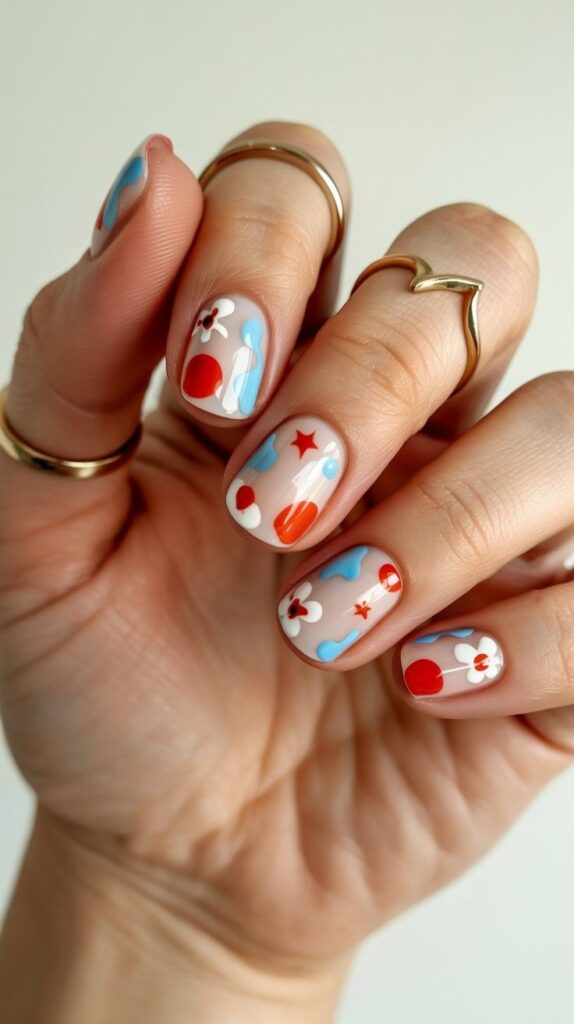 Sheer nude short squoval nails with red circles, blue splashes, white daisies, stars. Glossy, compact. Whimsical, confident, rebellious—joy as visual manifesto.