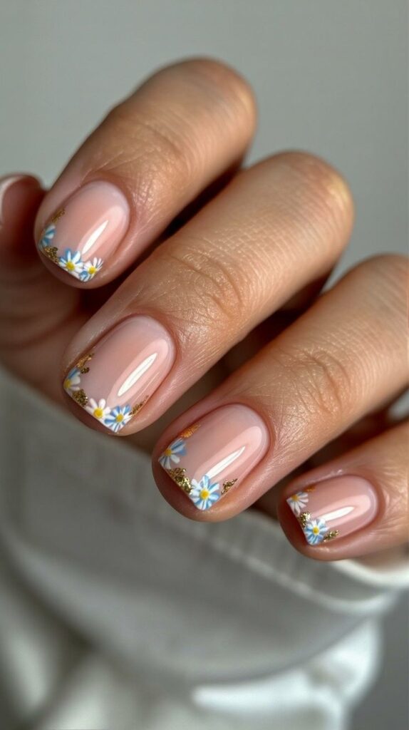 Soft blush-pink short squoval nails, two accent fingers adorned with scattered hand-painted white daisies (yellow centers), fine green vines, and delicate gold-leaf accents at the cuticle edge. The glossy finish makes the sparkle glow, and the compact shape ensures all-day wearability. Sweet, radiant, and deeply wearable—like joy wrapped in sunlight.